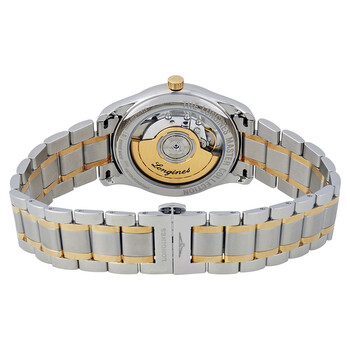 Gold stainless steel case with a stainless steel with gold bracelet. Fixed bezel. White dial with blue hands and Roman numeral hour markers. Date display at the 3 o'clock position. Automatic movement. Scratch resistant sapphire crystal. Pull / push crown. Transparent case back. Case diameter: 36 mm. Case thickness: 9.5 mm. Round case shape. Push button foldover clasp. Water resistant at 30 meters / 100 feet. Functions: date, hour, minute, second. Watch label: Swiss Made. Longines Master Automatic White Dial Stainless Steel with Gold Band Automatic Men's Watch L2.518.5.11.7.