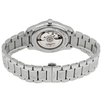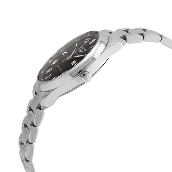 Stainless steel case with a stainless steel bracelet. Fixed stainless steel bezel. Black dial with silver-tone hands and Roman numeral hour markers. Arabic numeral minute markers (at 5 minute intervals). Minute markers around the outer rim. Dial Type: Analog. Month and date display at the 3 o'clock position. Longines calibre L897 automatic movement, based upon ETA A31.L81, containing 21 Jewels, bitting at 25200 vph, and has a power reserve of approximately 64 hours. Scratch resistant sapphire crystal. Pull / push crown. Transparent case back. Round case shape. Case size: 40 mm. Case thickness: 9.5 mm. Bracelet width: 20 mm. Push button fold over clasp. Water resistant at 30 meters / 99 feet. Functions: date, hour, minute, second. Master Collection Series. Dress watch style. Watch label: Swiss Made. Longines Master Collection Automatic Black Dial Watch L29104516.