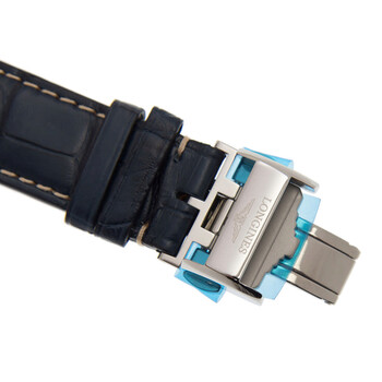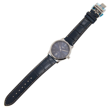 Stainless steel case with a blue (alligator) leather strap. Fixed domed stainless steel bezel. Blue dial with silver-tone hands and index hour markers. Arabic numeral minute markers (at 5 minute intervals). Minute markers around the outer rim. Dial Type: Analog. Date display at the 6 o'clock position. Longines calibre L619/888 automatic movement, based upon ETA 2892, containing 21 Jewels, bitting at 25200 vph, and has a power reserve of approximately 64 hours. Scratch resistant sapphire crystal. Pull / push crown. Transparent case back. Round case shape. Case size: 38.5 mm. Case thickness: 9.5 mm. Band width: 20 mm. Deployment clasp. Water resistant at 30 meters / 100 feet. Functions: date, hour, minute, second. Master Collection Series. Luxury watch style. Watch label: Swiss Made. Longines Master Collection Automatic Blue Dial Men's Watch L2.628.4.92.0.