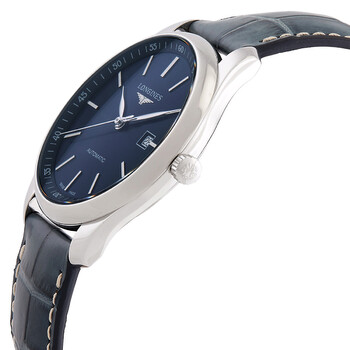 Silver-tone stainless steel case with a blue alligator/crocodile leather strap. Fixed bezel. Blue dial with silver-tone hands and index hour markers. Minute scale around the inner rim. Dial Type: Analog. Date display at the 3 o'clock position. ETA Caliber L888.2 ( A31.L01) automatic movement. Scratch resistant sapphire crystal. Pull / push crown. Transparent case back. Round case shape, case size: 42 mm, case thickness: 10.5 mm. Push button deployant buckle clasp. Water resistant at 30 meters / 99 feet. Functions: date, hour, minute, second. Master Collection Series. Dress watch style. Watch label: Swiss Made. Longines Master Collection Automatic Blue Dial Men's Watch L28934922.