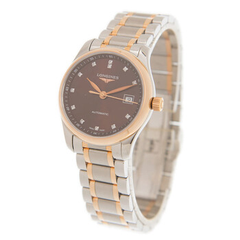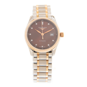 Silver-tone stainless steel case with a stainless steel and 18kt rose gold bracelet. Fixed 18kt rose gold bezel. Brown dial with rose gold-tone hands and diamond hour markers. Arabic numeral minute markers (at 5 minute intervals). Dial Type: Analog. Date display at the 3 o'clock position. Longines Calibre L595 Automatic movement, based upon ETA 2000/1, containing 20 Jewels, bitting at 28800 vph, and has a power reserve of approximately 40 hours. Scratch resistant sapphire crystal. Pull / push crown. Transparent case back. Round case shape, case size: 29 mm, case thickness: 9 mm. Fold over clasp with a safety release. Water resistant at 30 meters / 100 feet. Functions: date, hour, minute, second. Additional Info: 12 diamond hour markers (0.034 carats). Master Collection Series. Dress watch style. Watch label: Swiss Made. Longines Master Collection Automatic Diamond Brown Dial Ladies Watch L2.257.5.67.7.