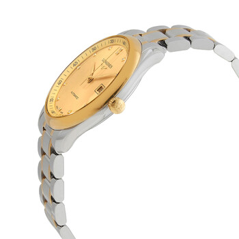 Stainless steel case with a stainless steel bracelet with 18kt yellow gold links. Fixed 18kt yellow gold bezel. Champagne dial with yellow gold hands and diamond hour markers. Arabic numeral minute markers (at 5 minute intervals). Minute markers around the outer rim. Dial Type: Analog. Date display at the 3 o'clock position. Automatic movement. Scratch resistant sapphire crystal. Pull / push crown. Transparent case back. Round case shape. Cse size: 40 mm. Case thickness: 9.5 mm. Fold over clasp. Water resistant at 30 meters / 99 feet. Functions: date, hour, minute, second. Additional Info: 13 diamond hour markers (0.059 carats). Master Collection Series. Dress watch style. Watch label: Swiss Made. Longines Master Collection Automatic Diamond Champagne Dial Men's Watch L27935377.