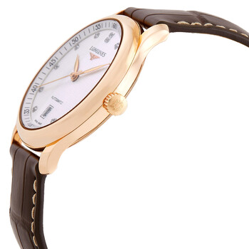 18kt rose gold case with a black leather strap. Fixed gold-tone bezel. Silver-tone dial with gold-tone hands and diamond hour markers. Minute markers around the outer rim. Dial Type: Analog. Date display at the 6 o'clock position. Longines Calibre L619 automatic movement with a 42-hour power reserve. Scratch resistant sapphire crystal. Transparent case back. Case size: 38.50 mm. Case thickness: 9.5 mm. Round case shape. Band width: 20 mm. Triple safety folding buckle clasp. Water resistant at 30 meters / 100 feet. Functions: date, hour, minute, second. Dress watch style. Watch label: Swiss Made. Longines Master Collection Automatic Diamond Men's Watch L2.628.8.77.3.