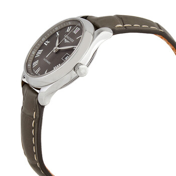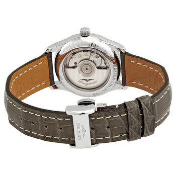 Stainless steel case with a grey (alligator) leather strap. Fixed stainless steel bezel. Sunray grey dial with silver-tone hands and Roman numeral hour markers. Arabic numeral minute markers (at 5 minute intervals). Minute markers around the outer rim. Dial Type: Analog. Date display at the 3 o'clock position. Caliber L592 automatic movement with a 45-hour power reserve. Scratch resistant sapphire crystal. Pull / push crown. Transparent case back. Round case shape. Case size: 29 mm. Case thickness: 9 mm. Band width: 15 mm. Fold over clasp. Water resistant at 30 meters / 100 feet. Functions: date, hour, minute, second. Master Collection Series. Dress watch style. Watch label: Swiss Made. Longines Master Collection Automatic Ladies Watch L2.257.4.71.3.