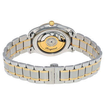 Stainless steel case with a stainless steel with 18kt yellow gold bracelet. Fixed 18kt yellow gold bezel. Gold dial with gold-tone hands and index hour markers. Minute markers around the outer rim. Dial Type: Analog. Date display at the 3 o'clock position. Automatic movement with about 42 hours of power reserve. Scratch resistant sapphire crystal. Transparent case back. Case size: 36 mm. Case thickness: 9.5 mm. Round case shape. Band width: 19 mm. Fold over clasp. Water resistant at 30 meters / 100 feet. Functions: date, hour, minute, second. Luxury watch style. Watch label: Swiss Made. Longines Master Collection Automatic Ladies Watch L2.518.5.32.7.