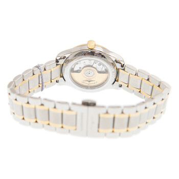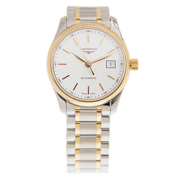 Stainless steel case with a stainless steel bracelet with 18kt yellow gold (cap 200) links. Fixed 18kt yellow gold (cap 200) bezel. White matt dial with yellow gold hands and index hour markers. Arabic numeral minute markers (at 5 minute intervals). Minute markers around the outer rim. Dial Type: Analog. Date display at the 3 o'clock position. Longines calibre L595 automatic movement, based upon ETA 2000/1, containing 20 Jewels, bitting at 28800 vph, and has a power reserve of approximately 40 hours. Scratch resistant sapphire crystal. Pull / push crown. Transparent case back. Round case shape. Case size: 29 mm. Case thickness: 9 mm. Fold over clasp. Water resistant at 30 meters / 100 feet. Functions: date, hour, minute, second. Master Collection Series. Casual watch style. Watch label: Swiss Made. Longines Master Collection Automatic Matt White Dial Steel and 18kt Yellow Gold Ladies Watch L2.257.5.12.7.