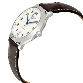 Stainless steel case with a brown alligator leather strap. Fixed stainless steel bezel. Silver dial with blue hands and Arabic numeral hour markers. Minute markers around the outer rim. Dial Type: Analog. Date display at the 6 o'clock position. Automatic movement. Scratch resistant sapphire crystal. Transparent case back. Case size: 38.5 mm. Case thickness: 9 mm. Round case shape. Band width: 20 mm. Deployment clasp. Water resistant at 30 meters / 100 feet. Functions: date, hour, minute, second. Luxury watch style. Watch label: Swiss Made. Longines Master Collection Automatic Men's Watch L2.628.4.78.5.