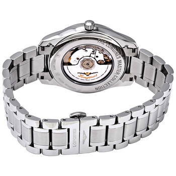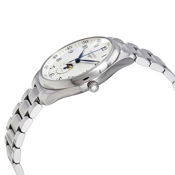 Stainless steel case with a stainless steel bracelet. Fixed stainless steel bezel. Silver "barleycorn" dial with blue hands and Arabic numeral hour markers. Minute markers around the outer rim. Dial Type: Analog. Date display at the 6 o'clock position. Combination: date / moon phase sub-dial. Longines calibre L899 automatic movement, based upon ETA A31.L91, containing 21 Jewels, bitting at 25200 vph, and has a power reserve of approximately 64 hours. Scratch resistant sapphire crystal. Pull / push crown. Transparent case back. Round case shape. Case size: 42 mm. Band width: 21 mm. Fold over clasp with a push button release. Water resistant at 30 meters / 100 feet. Functions: date, hour, minute, second, moonphase. Master Collection Series. Luxury watch style. Watch label: Swiss Made. Item Variations: L29194786. Longines Master Collection Automatic Men's Watch L2.919.4.78.6.