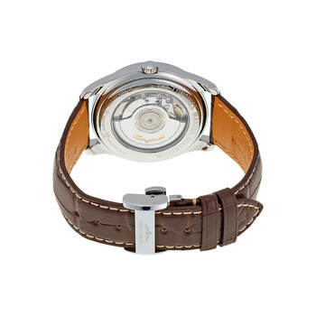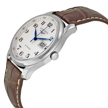 Stainless steel case with a brown (calfskin) leather strap. Fixed stainless steel bezel. Silver dial with blue hands and Arabic numeral hour markers. Minute markers around the outer rim. Dial Type: Analog. Date display at the 3 o'clock position. Automatic movement with a 42 hour power reserve. Scratch resistant sapphire crystal. Pull / push crown. Skeleton case back. Case diameter: 40 mm. Case thickness: 12 mm. Round case shape. Deployment clasp. Water resistant at 30 meters / 100 feet. Functions: date, hour, minute, second. Casual watch style. Watch label: Swiss Made. Item Variations: L2 648 4 78 3, L2-648-4-78-3, L2/648/4/78/3, L26484783. Longines Master Collection Automatic Silver Dial Brown Leather Men's Watch L2.648.4.78.3.