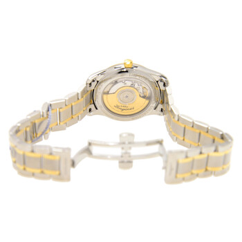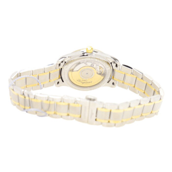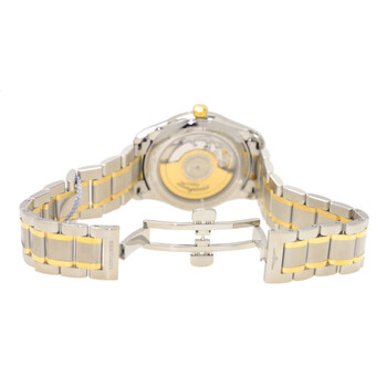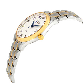 Stainless steel case with a stainless steel bracelet with 18kt yellow gold links. Fixed 18kt yellow gold bezel. Silver dial with blue hands and Arabic numeral hour markers. Arabic numeral minute markers (at 5 minute intervals). Minute markers around the outer rim. Dial Type: Analog. Date display at the 3 o'clock position. Longines calibre L619 automatic movement, based upon ETA 2892-A2, containing 21 Jewels, bitting at 28800 vph, and has a power reserve of approximately 42 hours. Scratch resistant sapphire crystal. Pull / push crown. Transparent case back. Round case shape. Case size: 36 mm. Band width: 19 mm. Hidden fold over clasp. Water resistant at 30 meters / 100 feet. Functions: date, hour, minute, second. Master Collection Series. Casual watch style. Watch label: Swiss Made. Item Variations: L25185787. Longines Master Collection Automatic Silver Dial Men's Watch L2.518.5.78.7.