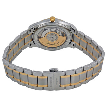 Silver-tone stainless steel case with a two-tone (silver-tone and yellow gold-tone) stainless steel with 18kt yellow gold bracelet. Fixed yellow gold-tone 18kt yellow gold bezel. White dial with yellow gold-tone hands and stick hour markers. Minute markers around the outer rim. Dial Type: Analog. Date display at the 3 o'clock position. Longines Calibre L619 Automatic movement, based upon ETA 2892-A2, containing 21 Jewels, bitting at 28800 vph, and has a power reserve of approximately 42 hours. Scratch resistant sapphire crystal. Skeleton case back. Round case shape, case size: 36 mm. Deployment with push button release clasp. Water resistant at 30 meters / 100 feet. Functions: date, hour, minute, second. Master Collection Series. Dress watch style. Watch label: Swiss Made. Item Variations: L2 518 5 12 7, L2-518-5-12-7, L2/518/5/12/7, L25185127. Longines Master Collection Automatic White Dial Men's Watch L2.518.5.12.7.