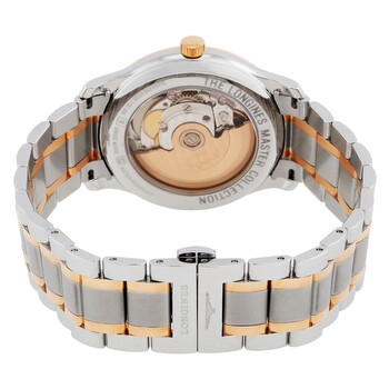 18kt rose gold case with a two-tone (silver-tone and gold-tone) stainless steel and 18kt rose gold bracelet. Fixed gold-tone bezel. White dial with blue hands and Arabic numeral hour markers. Minute markers around the outer rim. Dial Type: Analog. Day of the week and date display at the 3 o'clock position. Longines Calibre L636 automatic movement with a 38-hour power reserve. Scratch resistant sapphire crystal. Transparent case back. Round case shape, case size: 38.5 mm, case thickness: 9.5 mm. Band width: 20 mm. Push button folding clasp. Water resistant at 30 meters / 100 feet. Functions: date, day, hour, minute, second. Luxury watch style. Watch label: Swiss Made. Longines Master Collection Automatic White Dial Men's Watch L2.755.5.79.7.