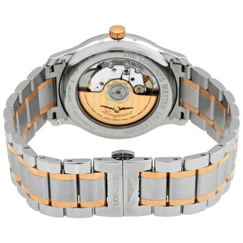 Silver-tone stainless steel case with a two-tone (silver-tone and rose gold-tone) stainless steel bracelet. Fixed 18kt rose gold bezel. White dial with blue hands and Roman numeral hour markers. Minute markers around the outer rim. Dial Type: Analog. Date display at the 6 o'clock position. Longines Calibre L619 Automatic movement, based upon ETA 2892-A2, containing 21 Jewels, bitting at 28800 vph, and has a power reserve of approximately 42 hours. Scratch resistant sapphire crystal. Transparent case back. Round case shape, case size: 38.5 mm, case thickness: 9.5 mm. Band width: 20 mm. Fold over clasp with a safety release. Water resistant at 30 meters / 100 feet. Functions: date, hour, minute, second. Master Collection Series. Luxury watch style. Watch label: Swiss Made. Longines Master Collection Automatic White Dial Men's Watch L2.628.5.19.7.