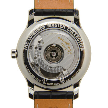 Silver-tone stainless steel case with a black leather strap. Fixed silver-tone stainless steel bezel. Black dial with silver-tone hands and Roman numeral hour markers. Minute markers around the outer rim. Dial Type: Analog. Date display at the 3 o'clock position. One - power reserve indicator subdial. Longines Calibre L602 automatic movement with a 42-hour power reserve. Scratch resistant sapphire crystal. Transparent case back. Round case shape. Case size: 38.5 mm. Band width: 20 mm. Push button deployant buckle clasp. Water resistant at 30 meters / 100 feet. Functions: date, hour, minute, second, power reserve indicator. Dress watch style. Watch label: Swiss Made. Longines Master Collection Automatic Black Dial Men's Watch L2.708.4.51.7.