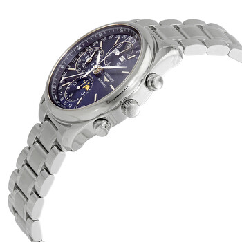 Stainless steel case with a stainless steel bracelet. Fixed stainless steel bezel. Blue dial with silver-tone leaf-style hands and index hour markers. Minute markers around the outer rim. Date scale around an inner ring. Dial Type: Analog. Luminescent hands and markers. Day of the week and month display below the 12 o'clock position. Chronograph - three sub-dials displaying: dual 60 seconds / 24 hours, 30 minutes and 12 hours. Moonphase display. Longines calibre L678 automatic movement, based upon Valjoux 7751, containing 25 Jewels, bitting at 28800 vph, and has a power reserve of approximately 48 hours. Scratch resistant sapphire crystal. Pull / push crown. Transparent case back. Round case shape. Case size: 40 mm. Case thickness: 14 mm. Band width: 22 mm. Band length: 7 inches. Deployment clasp. Water resistant at 30 meters / 100 feet. Functions: chronograph, month, date, day, GMT, moonphase, hours, minutes, second. Casual watch style. Watch label: Swiss Made. Longines Master Collection Complete Calendar Chronograph Automatic Blue Dial Men's Watch L26734926.