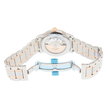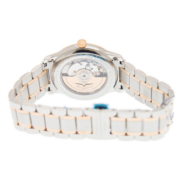 18kt rose gold case with a two-tone (silver-tone and rose gold-tone) stainless steel and 18kt rose gold bracelet. Fixed 18kt rose gold bezel. Grey dial with rose gold-tone hands and diamond hour markers. Minute markers around the outer rim. Dial Type: Analog. Date display at the 3 o'clock position. Longines Calibre L619 automatic movement with a 42-hour power reserve. Scratch resistant sapphire crystal. Transparent case back. Round case shape, case size: 38.5 mm, case thickness: 9.5 mm. Band width: 20 mm. Triple safety folding buckle clasp. Water resistant at 30 meters / 100 feet. Functions: date, hour, minute, second. Dress watch style. Watch label: Swiss Made. Longines Master Collection Automatic Diamond Grey Dial Men's Watch L2.628.5.07.7.