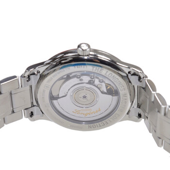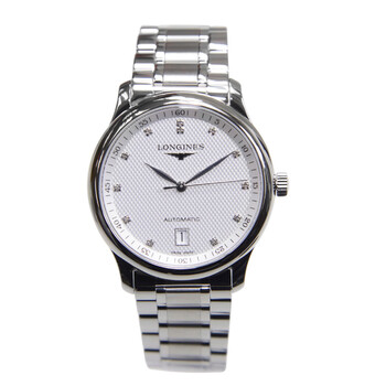Silver-tone stainless steel case with a silver-tone stainless steel bracelet. Fixed silver-tone stainless steel bezel. Silver-tone dial with silver-tone hands and diamond hour markers. Minute markers around the outer rim. Dial Type: Analog. Date display at the 6 o'clock position. Longines Calibre L619 automatic movement with a 42-hour power reserve. Scratch resistant sapphire crystal. Transparent case back. Round case shape, case size: 38.5 mm, case thickness: 9.5 mm. Band width: 20 mm. Triple safety folding buckle clasp. Water resistant at 30 meters / 100 feet. Functions: date, hour, minute, second. Dress watch style. Watch label: Swiss Made. Longines Master Collection Automatic Diamond Silver Dial Men's Watch L2.628.4.77.6.