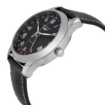 Stainless steel case with a black alligator leather strap. Fixed stainless steel bezel. Black dial with silver-toned hands and Roman numeral hour markers. 24 hour (GMT) scale. Minute markers around the outer rim. Dial Type: Analog. Date display at the 3 o'clock position. Automatic movement. Scratch resistant sapphire crystal. Pull / push crown. Skeleton case back. Case diameter: 42 mm. Round case shape. Deployment clasp. Water resistant at 30 meters / 100 feet. Functions: date, GMT, second time zone, hour, minute, second. Luxury watch style. Watch label: Swiss Made. Longines Master Collection GMT Automatic Black Dial Black Leather Men's Watch L2.718.4.50.7.