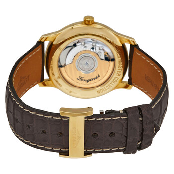 18ktyellow gold case with a brown leather strap. Fixed 18ktyellow gold bezel. Silver dial with blue hands and Arabic numeral hour markers. Minute markers around the outer rim. Dial Type: Analog. Date display at the 6 o'clock position. Automatic movement. Scratch resistant sapphire crystal. Transparent case back. Case size: 39 mm. Round case shape. Water resistant at 30 meters / 100 feet. Functions: date, hour, minute, second. Luxury watch style. Watch label: Swiss Made. Longines Master Silver Dial Automatic Men's Watch L2.628.6.78.5.