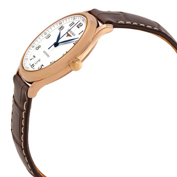 18kt rose case with a brown leather strap. Fixed 18kt rose gold bezel. Silver dial with blue hands and Arabic numeral hour markers. Minute markers around the outer rim. Dial Type: Analog. Date display at the 6 o'clock position. Caliber L619 automatic movement with a 42-hour power reserve. Scratch resistant sapphire crystal. Transparent case back. Case size: 39 mm. Round case shape. Deployment clasp. Water resistant at 30 meters / 100 feet. Functions: date, hour, minute, second. Luxury watch style. Watch label: Swiss Made. Longines Master Silver Dial Men's 18K Rose Gold Watch L2.628.8.78.5.