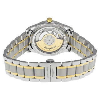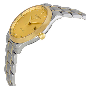 Silver-tone stainless steel case with a two-tone (silver and 18kt gold-plated) stainless steel bracelet. Fixed 18kt gold-plated silver-tone stainless steel bezel. Gold dial with gold-tone hands and diamond hour markers. Minute markers around the outer rim. Dial Type: Analog. Date display at the 3 o'clock position. Longines Calibre L619 automatic movement with a 42-hour power reserve. Scratch resistant sapphire crystal. Pull / push crown. Skeleton transparent exhibition see through case back. Case size: 36 mm. Round case shape. Triple safety clasp. Water resistant at 30 meters / 100 feet. Functions: date, hour, minute, second. Casual watch style. Watch label: Swiss Made. Item Variations: L2 518 5 37 7, L2-518-5-37-7, L2/518/5/37/7, L25185377. Longines Master Two-tone Gold Diamond Dial Men's Watch L2.518.5.37.7.