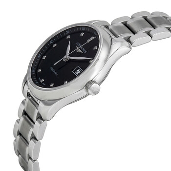 Stainless steel case with a stainless steel bracelet. Fixed stainless steel bezel. Black dial with silver-tone hands and diamond hour markers. Arabic numeral minute markers (at 5 minute intervals). Minute markers around the outer rim. Dial Type: Analog. Date display at the 3 o'clock position. Longines calibre L595/592 automatic movement with a 40 hour power reserve. Scratch resistant sapphire crystal. Push / pull crown. Transparent case back. Case diameter: 29 mm. Case thickness: 9 mm. Round case shape. Bracelet width: 15 mm. Fold over clasp with a push button release. Water resistant at 30 meters / 100 feet. Functions: date, hour, minute, second. Dress watch style. Longines Masters Collection Automatic Black Dial Stainless Steel Ladies Watch L22574576.