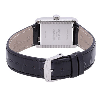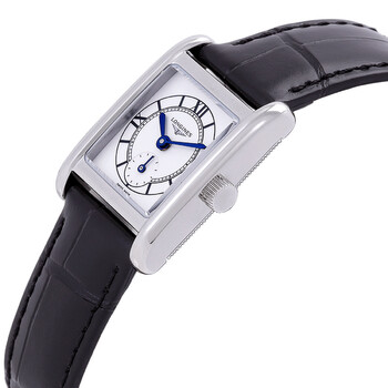 Silver-tone stainless steel case with a black alligator leather strap. Fixed silver-tone stainless steel bezel. Silver dial with blue hands and index-Roman numeral hour markers. Minute markers around the inner ring. Dial Type: Analog. One subdial displaying: small second. Longines Calibre L178 quartz movement. Scratch resistant sapphire crystal. Pull / push crown. Solid case back. Square case shape, case size: 21.5 x 29 mm, case thickness: 6.75 mm. Band width: 16 mm. Buckle clasp. Water resistant at 30 meters / 100 feet. Functions: hour, minute, small second. Mini Dolcevita Series. Casual watch style. Watch label: Swiss Made. Longines Mini Dolcevita Quartz Silver Dial Ladies Watch L5.200.4.75.2.