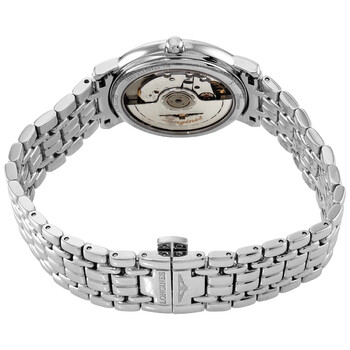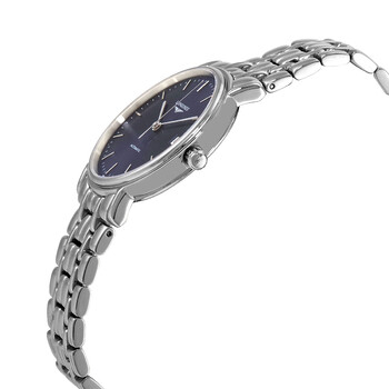 Silver-tone stainless steel case and bracelet. Fixed bezel. Blue dial with silver-tone hands and index hour markers. Dial Type: Analog. Date display at the 3 o'clock position. Longines Calibre L888 Automatic movement, based upon ETA A31.L11, containing 21 Jewels, bitting at 25200 vph, and has a power reserve of approximately 64 hours. Scratch resistant sapphire crystal. Pull / push crown. Round case shape, case size: 34.5 mm. Folding clasp. Water resistant at 30 meters / 100 feet. Functions: date, hour, minute, second. Presence Series. Dress watch style. Watch label: Swiss Made. Longines Presence Automatic Blue Dial Ladies Watch L4.821.4.92.6.