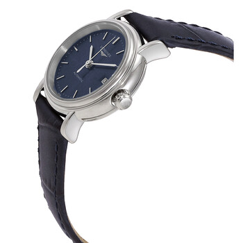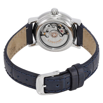 Stainless steel case with a blue (calfskin) leather strap. Fixed stainless steel bezel. Blue dial with silver-tone hands and index hour markers. Minute markers around the outer rim. Dial Type: Analog. Date display at the 3 o'clock position. Automatic movement. Scratch resistant sapphire crystal. Pull / push crown. Transparent case back. Round case shape. Case size: 25.5 mm. Band width: 13 mm. Tang clasp. Water resistant at 30 meters / 99 feet. Functions: date, hour, minute, second. Presence Series. Dress watch style. Watch label: Swiss Made. Longines Presence Automatic Blue Dial Ladies Watch L43214922.
