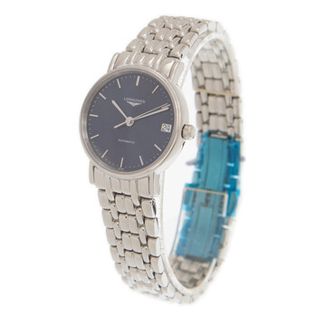 Silver-tone stainless steel case with a silver-tone stainless steel bracelet. Fixed silver-tone stainless steel bezel. Blue dial with silver-tone hands and index hour markers. Minute markers around the outer rim. Dial Type: Analog. Date display at the 3 o'clock position. Longines Calibre L888 automatic movement with a 64-hour power reserve. Scratch resistant sapphire crystal. Pull / push crown. Transparent case back. Round case shape. Case size: 30 mm. Deployment with push button release clasp. Water resistant at 30 meters / 100 feet. Functions: date, hour, minute, second. Additional Info: original box, international warranty card, manual (complete accessories). Luxury watch style. Watch label: Swiss Made. Longines Presence Automatic Blue Dial Unisex Watch L4.322.4.92.6.