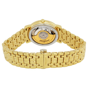 Yellow gold PVD stainless steel case and bracelet. Fixed yellow gold PVD bezel. Gold dial with gold-tone hands and index hour markers. Minute markers around the outer rim. Dial Type: Analog. Date display at the 3 o'clock position. Longines calibre L619/888 automatic movement with a 42-hour power reserve. Scratch resistant sapphire crystal. Pull / push crown. Transparent case back. Round case shape, case size: 34 mm, case thickness: 6 mm. Band width: 18 mm. Hidden fold over clasp. Water resistant at 30 meters / 100 feet. Functions: date, hour, minute, second. Dress watch style. Watch label: Swiss Made. Longines Presence Automatic Gold Dial Ladies Watch L48212328.