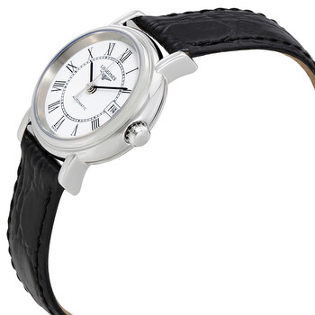 Stainless steel case with a black leather strap. Fixed stainless steel bezel. White dial with black hands and Roman numeral hour markers. Minute markers around an inner ring. Dial Type: Analog. Date display at the 3 o'clock position. Longines calibre 561 automatic movement with a 38-hour power reserve. Scratch resistant sapphire crystal. Push / pull crown. Transparent case back. Case size: 25.5 mm. Round case shape. Band width: 13 mm. Tang clasp. Water resistant at 30 meters / 100 feet. Functions: date, hour, minute, second. Dress watch style. Watch label: Swiss Made. Longines Presence Automatic White Dial Ladies WatchL43214112.