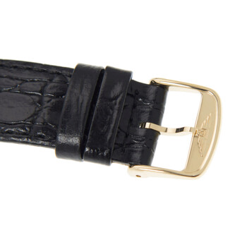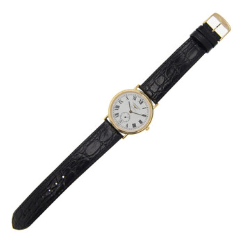 Yellow gold PVD stainless steel case with a black leather strap. Fixed yellow gold PVD bezel. White dial with black hands and Roman numeral hour markers. Minute markers around than inner ring. Dial Type: Analog. Date display at the 6 o'clock position. Small seconds sub-dial. Longines calibre L615 automatic movement, based upon ETA 2895-2, containing 27 Jewels, bitting at 28800 vph, and has a power reserve of approximately 42 hours. Scratch resistant sapphire crystal. Pull / push crown. Transparent case back. Round case shape. Case size: 34.5 mm. Band width: 18 mm. Tang clasp. Water resistant at 30 meters / 100 feet. Functions: date, hour, minute, second. Presence Series. Dress watch style. Watch label: Swiss Made. Longines Presence Automatic White Dial Ladies Watch L4.804.2.11.2.
