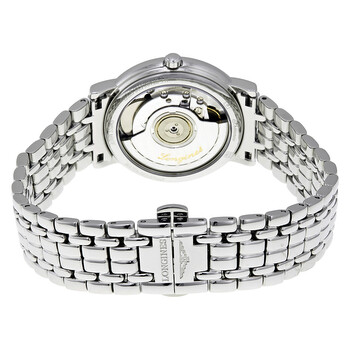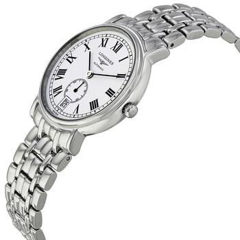 Stainless steel case with a stainless steel bracelet. Fixed stainless steel bezel. White dial with silver-tone hands and Roman numeral hour markers. Minute markers around the outer rim. Dial Type: Analog. Date display above the 6 o'clock position. Small seconds sub-dial. Longines calibre L615 automatic movement with a 42-hour power reserve. Scratch resistant sapphire crystal. Transparent case back. Case size: 34 mm. Round case shape. Band width: 18 mm. Hidden fold over clasp. Water resistant at 30 meters / 100 feet. Functions: date, hour, minute, second. Casual watch style. Watch label: Swiss Made. Longines Presence Automatic White Dial Ladies Watch L4.804.4.11.6.