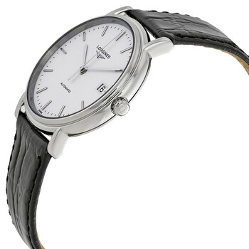 Stainless steel case with a black leather strap. Fixed stainless steel bezel. White dial with silver-tone hands and index hour markers. Minute markers around the outer rim. Dial Type: Analog. Date display at the 3 o'clock position. Longines calibre L619/888 automatic movement, based upon ETA 2892, containing 21 Jewels, bitting at 25200 vph, and has a power reserve of approximately 64 hours. Scratch resistant sapphire crystal. Pull / push crown. Transparent case back. Round case shape. Case size: 34 mm. Case thickness: 6 mm. Band width: 18 mm. Tang clasp. Water resistant at 30 meters / 100 feet. Functions: date, hour, minute, second. Presence Series. Dress watch style. Watch label: Swiss Made. Item Variations: L48214122. Longines Presence Automatic White Dial Ladies Watch L4.821.4.12.2.
