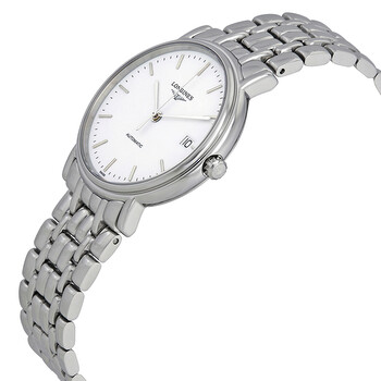 Stainless steel case with a stainless steel bracelet. Fixed stainless steel bezel. White dial with silver-tone hands and index hour markers. Minute markers around the outer rim. Dial Type: Analog. Date display at the 3 o'clock position. Longines calibre L619/888 automatic movement, based upon ETA 2892, containing 21 Jewels, bitting at 25200 vph, and has a power reserve of approximately 64 hours. Scratch resistant sapphire crystal. Pull / push crown. Transparent case back. Round case shape. Case size: 34.50 mm. Case thickness: 7 mm. Band width: 18 mm. Fold over clasp with a push button release. Water resistant at 30 meters / 100 feet. Functions: date, hour, minute, second. Presence Series. Dress watch style. Watch label: Swiss Made. Longines Presence Automatic White Dial Ladies Watch L4.821.4.12.6.