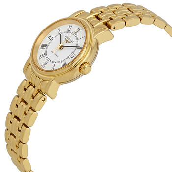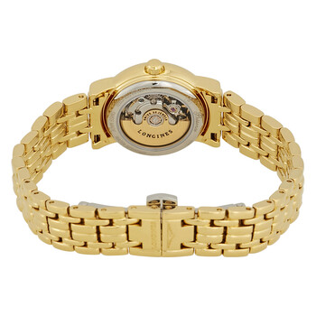 Gold-tone stainless steel case and bracelet. Fixed gold-tone bezel. White dial with black hands and Roman numeral hour markers. Minute markers around an inner ring. Dial Type: Analog. Date display at the 3 o'clock position. Automatic movement with a 38-hour power reserve. Scratch resistant sapphire crystal. Transparent case back. Case size: 25.5 mm. Round case shape. Band width: 13 mm. Fold over clasp. Water resistant at 30 meters / 100 feet. Functions: date, hour, minute, second. Luxury watch style. Watch label: Swiss Made. Longines Presence Automatic White Dial Ladies Watch L43212118