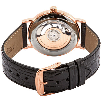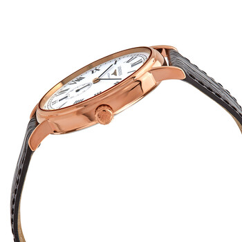 Rose gold PVD stainless steel case with a black leather strap. Fixed rose gold PVD bezel. White dial with black hands and Roman numeral hour markers. Minute markers around the outer rim. Dial Type: Analog. Date display at the 6 o'clock position. Small seconds sub-dial above the 6 o'clock position. Longines calibre L615 automatic movement, based upon ETA 2895-2, containing 27 Jewels, bitting at 28800 vph, and has a power reserve of approximately 42 hours. Scratch resistant sapphire crystal. Pull / push crown. Transparent case back. Round case shape. Case size: 38.50 mm. Band width: 20 mm. Tang clasp. Water resistant at 30 meters / 100 feet. Functions: date, hour, minute, small second. Additional Info: original box, international warranty card, manual (complete accessories). Presence Series. Dress watch style. Watch label: Swiss Made. Longines Presence Automatic White Dial Men's Watch L4.805.1.11.2.