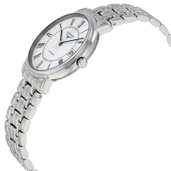 Stainless steel case with a stainless steel bracelet. Fixed stainless steel bezel. White dial with black hands and Roman numeral hour markers. Minute markers around an inner ring. Dial Type: Analog. Date display at the 3 o'clock position. Longines calibre L619 automatic movement, based upon ETA 2892-A2, containing 21 Jewels, bitting at 28800 vph, and has a power reserve of approximately 42 hours. Scratch resistant sapphire crystal. Pull / push crown. Skeleton case back. Round case shape. Case size: 34.5 mm. Case thickness: 6 mm. Band width: 18 mm. Deployment clasp. Water resistant at 30 meters / 100 feet. Functions: date, hour, minute, second. Presence Series. Dress watch style. Watch label: Swiss Made. Item Variations: L48214116. Longines Presence Automatic White Dial Men's Watch L4.821.4.11.6.