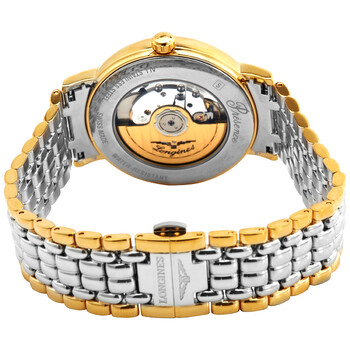 Yellow PVD stainless steel case with a two-tone (silver-tone and yellow PVD) stainless steel bracelet. Fixed yellow PVD bezel. Matt white dial with black hands and Roman numeral hour markers. Minute markers around the outer rim. Dial Type: Analog. Date display at the 6 o'clock position. Small seconds sub-dial. Automatic movement. Scratch resistant sapphire crystal. Pull / push crown. Transparent case back. Round case shape. Case size: 40 mm. Band width: 20 mm. Fold over clasp. Water resistant at 30 meters / 100 feet. Functions: date, hour, minute, second. Presence Series. Dress watch style. Watch label: Swiss Made. Longines Presence Automatic White Dial Men's Watch L4.905.2.11.7.