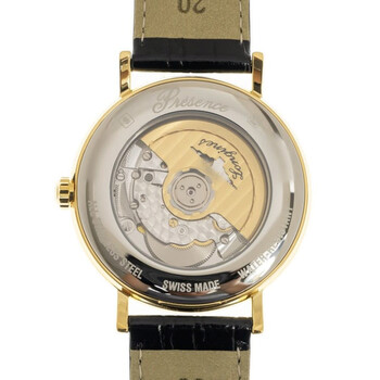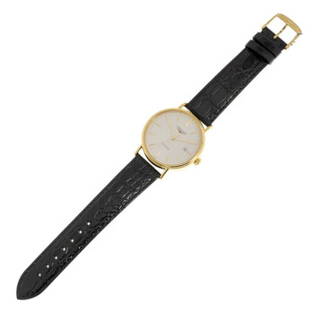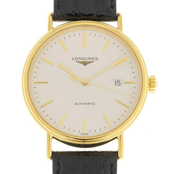 Yellow gold-tone stainless steel case with a black leather strap. Fixed yellow gold-tone stainless steel bezel. White dial with yellow gold-tone hands and index hour markers. Minute markers around the outer rim. Dial Type: Analog. Date display at the 3 o'clock position. Automatic movement. Scratch resistant sapphire crystal. Transparent see through case back. Round case shape, case size: 40 mm. Buckle clasp. Functions: date, hour, minute, second. Additional Info: original box, international warranty card, manual (complete accessories). Presence Series. Luxury watch style. Watch label: Swiss Made. Longines Presence Automatic White Dial Men's Watch L4.922.2.12.2.
