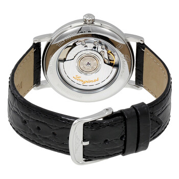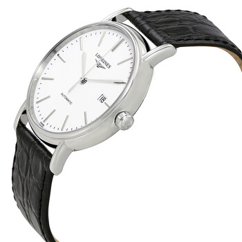 Silver-tone stainless steel case with a black leather strap. Fixed silver-tone stainless steel bezel. White dial with silver-tone hands and index hour markers. Minute markers around the outer rim. Dial Type: Analog. Date display at the 3 o'clock position. Longines Calibre L619/888 Automatic movement, based upon ETA 2892, containing 21 Jewels, bitting at 25200 vph, and has a power reserve of approximately 64 hours. Scratch resistant sapphire crystal. Pull / push crown. Transparent case back. Round case shape, case size: 38.5 mm, case thickness: 8 mm. Band width: 20 mm. Tang clasp. Water resistant at 30 meters / 100 feet. Functions: date, hour, minute, second. Presence Series. Luxury watch style. Watch label: Swiss Made. Longines Presence Automatic White Dial Men's Watch L49214122.