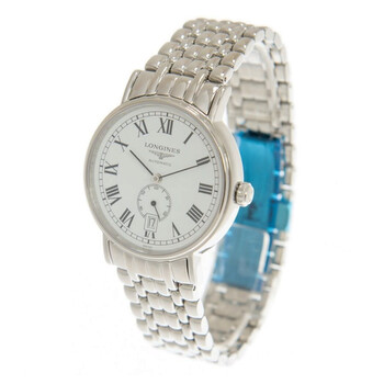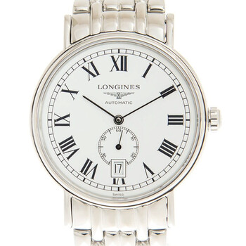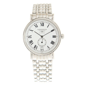 Silver-tone stainless steel case and bracelet. Fixed silver-tone stainless steel bezel. White dial with black hands and Roman numeral hour markers. Minute markers around the outer rim. Dial Type: Analog. Date display at the 6 o'clock position. One subdial displaying: small second. ETA Caliber 2895-2 Automatic movement, based upon ETA 2892-A2, containing 27 Jewels, bitting at 28800 vph, and has a power reserve of approximately 42 hours. Scratch resistant sapphire crystal. Transparent see through case back. Round case shape, case size: 38 mm. Deployment with push button release clasp. Water resistant at 30 meters / 100 feet. Functions: date, hour, minute, second. Additional Info: original box, international warranty card, manual (complete accessories). Presence Series. Luxury watch style. Watch label: Swiss Made. Longines Presence Automatic White Dial Unisex Watch L49044116.