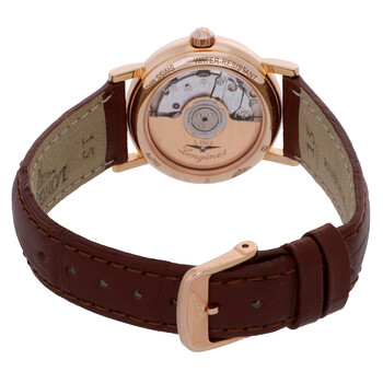 18kt rose gold case with a brown alligator leather strap. Fixed 18kt rose gold bezel. Silver dial with blue hands and Arabic numeral hour markers. Dial Type: Analog. Date display at the 3 o'clock position. Longines Calibre L595 Automatic movement, based upon ETA 2000/1, containing 20 Jewels, bitting at 28800 vph, and has a power reserve of approximately 40 hours. Scratch resistant sapphire crystal. Pull / push crown. Transparent see through case back. Round case shape, case size: 26.4 mm. Band width: 15 mm. Buckle clasp. Water resistant at 30 meters / 100 feet. Functions: date, hour, minute, second. Presence Heritage Series. Luxury watch style. Watch label: Swiss Made. Longines Presence Heritage Automatic Silver Dial Ladies Watch L4.267.8.73.2.