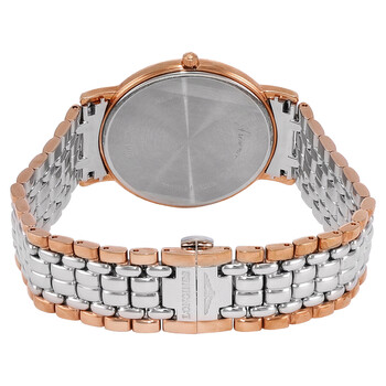 Rose gold-tone stainless steel case with a two-tone (silver-tone and rose gold-tone) stainless steel bracelet. Fixed rose gold-tone stainless steel bezel. Black dial with rose gold-tone hands and index hour markers. Minute markers around the outer rim. Dial Type: Analog. Date display at the 3 o'clock position. Quartz movement. Scratch resistant sapphire crystal. Round case shape, case size: 38.5 mm. Fold over clasp with a safety release. Water resistant at 30 meters / 100 feet. Functions: date, hour, minute, second. Presence Series. Dress watch style. Watch label: Swiss Made. Longines Presence Quartz Black Dial Men's Watch L47901597.