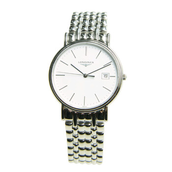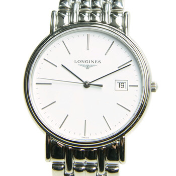 Silver-tone stainless steel case and bracelet. Fixed silver-tone stainless steel bezel. White dial with silver-tone hands and index hour markers. Dial Type: Analog. Date display at the 3 o'clock position. Longines Calibre L157 quartz movement. Scratch resistant sapphire crystal. Pull / push crown. Solid case back. Round case shape, case size: 38 mm, case thickness: 6 mm. Fold over clasp with a safety release. Water resistant at 30 meters / 100 feet. Functions: date, hour, minute, second. Presence Series. Luxury watch style. Watch label: Swiss Made. Item Variations: L4 790 4 12 6, L4-790-4-12-6, L4/790/4/12/6, L47904126. Longines PRESENCE White Dial Men's Watch L4.790.4.12.6.