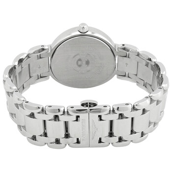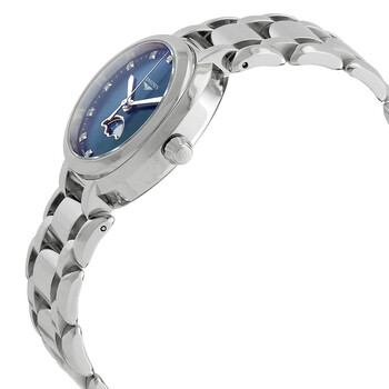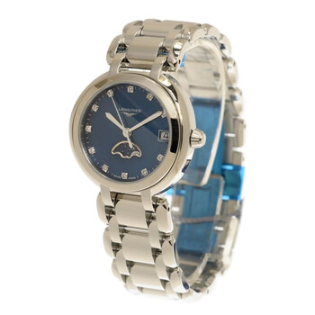 Stainless steel case with a stainless steel bracelet. Fixed stainless steel bezel. Blue mother of pearl dial with silver-tone hands and diamond hour markers. Minute markers around the outer rim. Dial Type: Analog. Date display at the 3 o'clock position. Moonphase display. Longines calibre L296 quartz movement. Scratch resistant sapphire crystal. Solid case back. Round case shape. Case size: 30 mm. Case thickness: 9.3 mm. Deployment clasp with a push button release. Water resistant at 30 meters / 100 feet. Functions: moon phase, date, hour, minute, second. Additional Info: original box, manual (complete accessories). Prima Luna Series. Luxury watch style. Watch label: Swiss Made. Longines Prima Luna Quartz Diamond Ladies Watch L8.115.4.98.6.