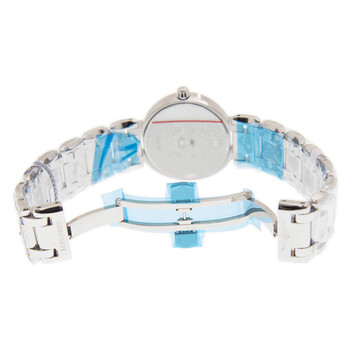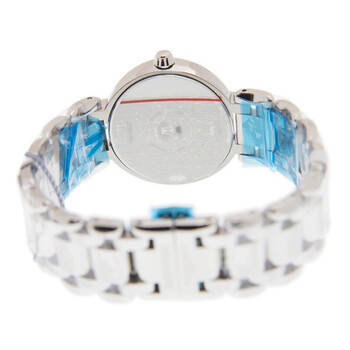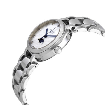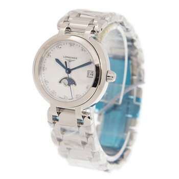 Stainless steel case with a stainless steel bracelet. Fixed stainless steel bezel. White mother of pearl dial with blue sword-shaped hands and dial hour markers. Minute markers around the outer rim. Dial Type: Analog. Date display at the 3 o'clock position. Moonphase display. Longines calibre L296 quartz movement. Scratch resistant sapphire crystal. Pull / push crown. Solid case back. Round case shape. Case size: 30.5 mm. Butterfly clasp. Water resistant at 30 meters / 100 feet. Functions: moon phase, date, hour, minute, second. Additional Info: original box, manual (complete accessories). dial: 11 top wesselton vs-si diamonds (total of 0.044 carats). Prima Luna Series. Luxury watch style. Watch label: Swiss Made. Longines Prima Luna Quartz Diamond White Dial Unisex Watch L8.115.4.87.6.
