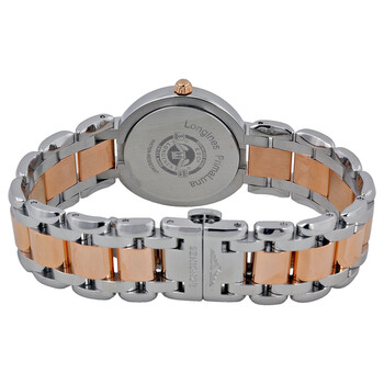 Two-tone stainless steel and 18kt rose gold case with a two-tone stainless steel and 18kt rose gold bracelet. Fixed two-tone bezel. Silver dial with blue steel hands and Roman numeral hour markers. Minute markers around the outer rim. Date display appears at the 3 o'clock position. Quartz movement. Scratch resistant sapphire crystal. Solid case back. Case diameter: 30 mm. Hidden folding clasp. Water resistant at 30 meters/ 100 feet. Functions: hours, minutes, seconds, calendar. Longines Prima Luna Quartz Ladies Watch L8.112.5.78.6.