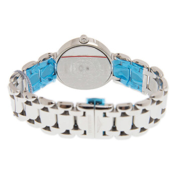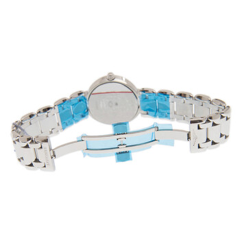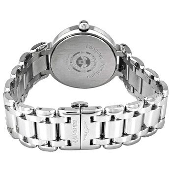 Stainless steel case with a stainless steel bracelet. Fixed stainless steel bezel. White dial with blued-steel sword-shaped hands and Roman numeral hour markers. Minute markers around the outer rim. Dial Type: Analog. Date display at the 3 o'clock position. Moonphase display. Longines calibre L296 quartz movement. Scratch resistant sapphire crystal. Solid case back. Round case shape. Case size: 30 mm. Case thickness: 9.3 mm. Band width: 7 mm. Butterfly clasp. Water resistant at 30 meters / 100 feet. Functions: moon phase, date, hour, minute, second. Prima Luna Series. Luxury watch style. Watch label: Swiss Made. Longines Prima Luna Quartz White Dial Ladies Watch L8.115.4.71.6.